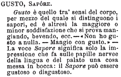 | Gusto, Sapore - Gusto è quello tra' sensi del corpo, per mezzo del quale si distinguono i sapori, ed è altresì la maggiore o minor soddisfazione che si prova mangiando, bevendo, ecc. - «Non ho gusto a nulla. - Mangio con gusto.» - La voce Sapore significa solo la impressione che fa sulle papille nervee della lingua e del palato una cosa messa in bocca: il Sapore può essere gustoso o disgustoso. [immagine] |
