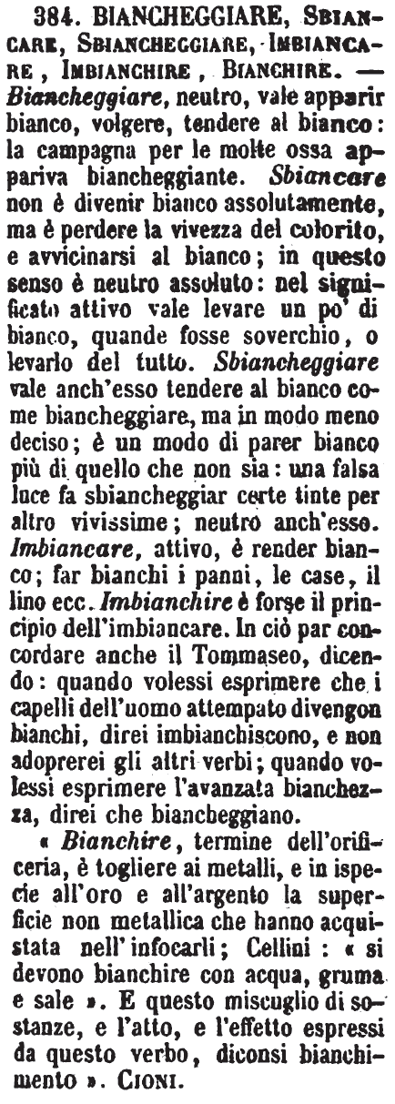 Biancheggiare, Sbiancare, Sbiancheggiare, Imbiancare, Imbianchire, Bianchire - Biancheggiare, neutro, vale apparir bianco, volgere, tendere al bianco: la campagna per le molte ossa appariva biancheggiante. Sbiancare non è divenir bianco assolutamente, ma è perdere la vivezza del colorito, e avvicinarsi al bianco; in questo senso è neutro assoluto: nel significato attivo vale levare un po' di bianco, quando fosse soverchio, o levarlo del tutto. Sbiancheggiare vale anch'esso tendere al bianco come biancheggiare, ma in modo meno deciso; è un modo di parer bianco più di quello che non sia: una falsa luce fa sbiancheggiar certe tinte per altro vivissime; neutro anch'esso. Imbiancare, attivo, è render bianco; far bianchi i panni, le case, il lino ecc. Imbianchire è forse il principio dell'imbiancare. In ciò par concordare anche il Tommaseo, dicendo: quando volessi esprimere che i capelli dell'uomo attempato divengon bianchi, direi imbianchiscono, e non adoprerei gli altri verbi; quando volessi esprimere l'avanzata bianchezza, direi che biancheggiano.