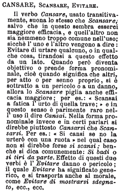 Cansare, Scansare, Evitare - Il verbo Cansare, usato transitivamente, suona lo stesso che Scansare; salvo che in questo sembra esserci maggiore efficacia, e quell'altro non sia nemmeno troppo comune nell'uso; sicchè l'uno e l'altro vengono a dire: Evitare di urtare qualcuno, o in qualche cosa, tirandosi a questo effetto da un lato. Quando però diventa objettivo o prende forma pronominale, cioè quando significa che altri, per atto o per senno proprio, si è sottratto a un pericolo o a un danno, allora lo Scansare piglia anche efficacia maggiore; per es.: «Scansai a fatica l'urto di quella trave;» e in questo senso è parimente raro nell'uso il dire Cansai. Nella forma pronominale invece e in certi parlari si direbbe piuttosto Cansarsi che Scansarsi. Per es.: «Si cansi se no la urterò con una ruota» nel qual caso non si direbbe forse si scansi; benchè si dica comunemente: Si badi o si tiri da parte. Effetto di questi due verbi è l'Evitare danno o pericolo; il quale Evitare ha significato generico, e si trasporta anche al morale, come Evitare di mostrarsi sdegnato, ecc., ecc. [immagine]