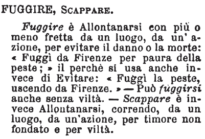 | Fuggire, Scappare - Fuggire è Allontanarsi con più o meno fretta da un luogo, da un'azione, per evitare il danno o la morte: «Fuggì da Firenze per paura della peste;» il perchè si usa anche invece di Evitare: «Fuggì la peste, uscendo da Firenze.» - Può fuggirsi anche senza viltà - Scappare è invece Allontanarsi, correndo, da un luogo, da un'azione, per timore non fondato e per viltà. [immagine] |