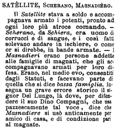 | Satellite, Scherano, Masnadiero - Il Satellite stava a soldo e accompagnava armato i potenti, pronto ad ogni loro più atroce comando. - Scherano, da Schiera, era uomo di corrucci e di sangue, e i così fatti solevano andare in ischiere, o come or si direbbe, in bande armate. - I Masnadieri erano persone addette alle famiglie di magnati, che gli accompagnavano armati per loro difesa. Erano, nel medio evo, consentiti dagli Statuti, e facevano parte di quella che si dice bassa famiglia. Insegna un grave errore storico il signor Del Lungo, là dove, per difendere il suo Dino Compagni, che usa pazzescamente tal voce, dice che Masnadiere si usò anticamente per amico di casa, e di condizione pari al magnate. [immagine] |