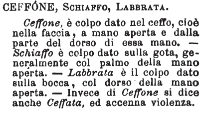 | Ceffone, Schiaffo, Labbrata - Ceffone, è colpo dato nel ceffo, cioè nella faccia, a mano aperta e dalla parte del dorso di essa mano. - Schiaffo è colpo dato sulla gota, generalmente col palmo della mano aperta. - Labbrata è il colpo dato sulla bocca, col dorso della mano aperta. - Invece di Ceffone si dice anche Ceffata, ed accenna violenza. [immagine] |