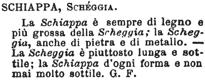 | Schiappa, Scheggia - La Schiappa è sempre di legno e più grossa della Scheggia; la Scheggia, anche di pietra e di metallo. - La Scheggia è piutosto lunga e sottile; la Schiappa d'ogni forma e non mai molto sottile. G. F. [immagine] |