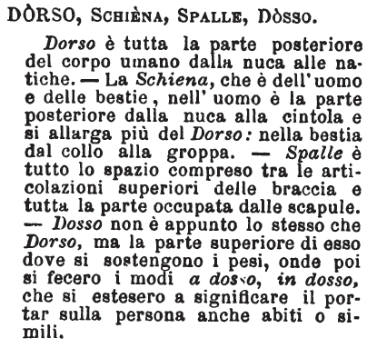 | Dorso, Schiena, Spalle, Dosso - Dorso è tutta la parte posteriore del corpo umano dalla nuca alle natiche. - La Schiena, che è dell'uomo e delle bestie, nell'uomo è la parte posteriore dalla nuca alla cintola e si allarga più del Dorso: nella bestia dal collo alla groppa. - Spalle è tutto lo spazio compreso tra le articolazioni superiori delle braccia e tutta la parte occupata dalle scapule. - Dosso non è appunto lo stesso che Dorso, ma la parte superiore di esso dove si sostengono i pesi, onde poi si fecero i modi a dosso, in dosso, che si estesero a significare il portar sulla persona anche abiti o simili. [immagine] |