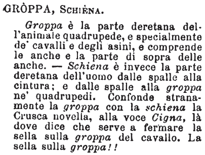 | Groppa, Schiena - Groppa è la parte deretana dell'animale quadrupede, e specialmente de' cavalli e degli asini, e comprende le anche e la parte di sopra delle anche. - Schiena è invece la parte deretana dell'uomo dalle spalle alla cintura; e dalle spalle alla groppa ne' quadrupedi. Confonde stranamente la groppa con la schiena la Crusca novella, alla voce Cigna, là dove dice che serve a fermare la sella sulla groppa del cavallo. La sella sulla groppa!! [immagine] |