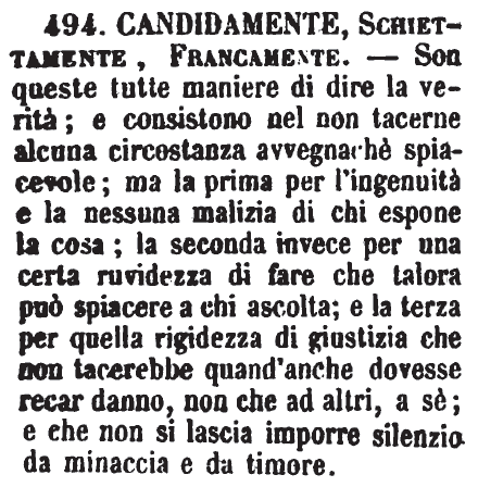 | Candidamente, Schiettamente, Francamente - Son queste tutte maniere di dire la verità; e consistono nel non tacerne alcuna circostanza avvegnachè spiacevole; ma la prima per l'ingenuità e la nessuna malizia di chi espone la cosa; la seconda invece per una certa ruvidezza di fare che talora può spiacere a chi ascolta; e la terza per quella rigidezza di giustizia che non tacerebbe quand'anche dovesse recar danno, non che ad altri, a sè; e che non si lascia imporre silenzio da minaccia e da timore. [immagine] |