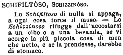 | Schifiltoso - Agg. Che schifa, schivo, Ritroso, Difficile a contentarsi, specialmente in cosa di gusti e di sapori. (Fanf.) T. In questo e in altro senso, anche ass. È troppo schifiltoso. Fare la schifiltosa.