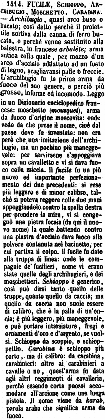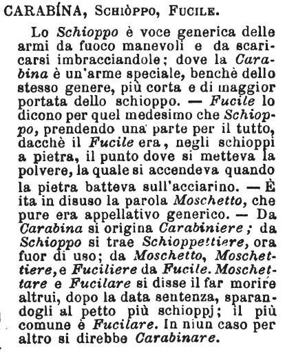 | Carabina, Schioppo, Fucile - Lo Schioppo è voce generica delle armi da fuoco manevoli e da scaricarsi imbracciandole: dove la Carabina è un'arme speciale, benché dello stesso genere, più corta e di maggior portata dello schioppo. - Fucile lo dicono per quel medesimo che Schioppo, prendendo una parte per il tutto, dacché il Fucile era, negli schioppi a pietra, il punto dove si metteva la polvere, la quale si accendeva quando la pietra batteva sull'acciarino. - È ita in disuso la parola Moschetto, che pure era appellativo generico. - Da Carabina si origina Carabiniere; da Schioppo si trae Schioppettiere, ora fuor di uso; da Moschetto, Moschettiere, e Fuciliere da Fucile. Moschettare e Fucilare si disse il far morire altrui, dopo la data sentenza, sparandogli al petto più schioppj; il più comune è Fucilare. In niun caso per altro si direbbe Carabinare. [immagine] |