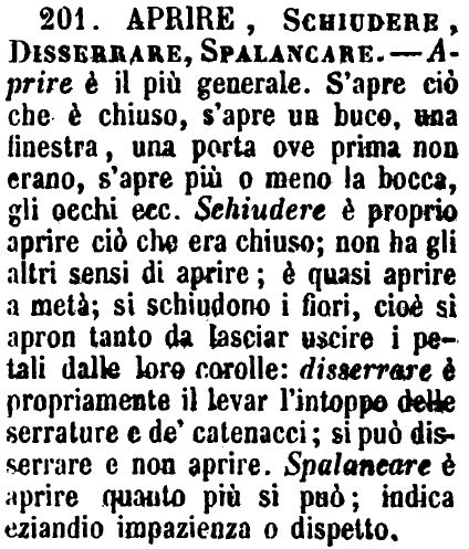 | Aprire, Schiudere, Disserrare, Spalancare - Aprire è il più generale. S'apre ciò che è chiuso, s'apre un buco, una finestra, una porta ove prima non erano, s'apre più o meno la bocca, gli occhi ecc. Schiudere è proprio aprire ciò che era chiuso; non ha gli altri sensi di aprire; è quasi aprire a metà; si schiudono i fiori, cioè si apron tanto da lasciar uscire i petali dalle loro corolle: disserrare è propriamente il levar l'intoppo delle serrature e de' catenacci; si può disserrare e non aprire. Spalancare è aprire quanto più si può; indica eziandio impazienza o dispetto. [immagine] |