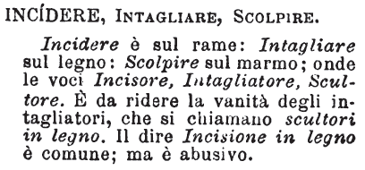 | Incidere, Intagliare, Scolpire - Incidere è sul rame: Intagliare sul legno: Scolpire sul marmo; onde le voci Incisore, Intagliatore, Scultore. E' da ridere la vanità degli intagliatori, che si chiamano scultori in legno. Il dire Incisione in legno è comune; ma è abusivo. [immagine] |