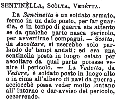 | Sentinella, Scolta, Vedetta - La Sentinella è un soldato armato, fermo in un dato posto, per far guardia, e in tempo di guerra sta attento se da qualche parte nasca pericolo, per avvertirne i compagni. - Scolta, da Ascoltare, si userebbe solo parlando de' tempi andati; ed era una sentinella posta in luogo celato per ascoltare da qual parte potesse venire il pericolo. - La Vedetta, da Vedere, è soldato posto in luogo alto o in cima all'albero di navi da guerra, acciocchè possa veder molto lontano all'intorno e dar avviso del pericolo, occorrendo. [immagine] |