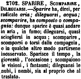 | Sparire, Scomparire, Dileguarsi - Sparire ha, direi, per radicale aria; dileguarsi, acqua; scomparire ha composto o compagnia: dunque sparire è quasi andare in aria, in fumo; dileguarsi, quasi sciogliersi in acqua; scomparire, scomporsi o torsi dalla compagnia, o in qualche altro modo partirsene inosservato. Sparisce il tempo, la gioventù, l'occasione; scompaiono le visioni, i fantasmi; dileguansi le nubi, i nembi, sia al proprio che al traslato. [immagine] |