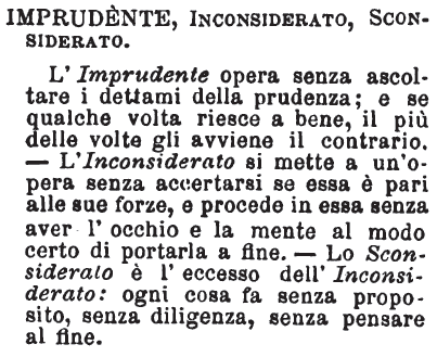 | Imprudente, Inconsiderato, Sconsiderato - L'Imprudente opera senza ascoltare i dettami della prudenza; e se qualche volta riesce a bene, il più delle volte gli avviene il contrario. - L'Inconsiderato si mette a un'opera senza accertarsi se essa è pari alle sue forze, e procede in essa senza aver l'occhio e la mente al modo certo di portarla a fine. - Lo Sconsiderato è l'eccesso dell'Inconsiderato: ogni cosa fa senza proposito, senza diligenza, senza pensare al fine. [immagine] |