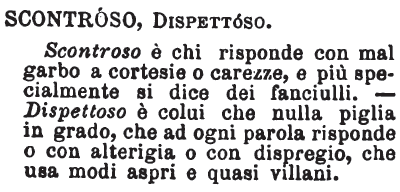 | Scontroso, Dispettoso - Scontroso è chi risponde con mal garbo a cortesie o carezze, e più specialmente si dice dei fanciulli. - Dispettoso è colui che nulla piglia in grado, che ad ogni parola risponde o con alterigia o con dispregio, che usa modi aspri e quasi villani. [immagine] |