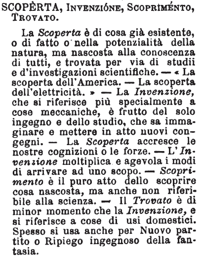 | Scoperta, Invenzione, Scoprimento, Trovato - La Scoperta è di casa già esistente, o di fatto o nella potenzialità della natura, ma nascosta alla conoscenza di tutti, e trovata per via di studii e d'investigazioni scientifiche. - «La scoperta dell'America. - La scoperta dell'elettricità.» - La Invenzione, che si riferisce più specialmente a cose meccaniche, è frutto del solo ingegno e dello studio, che sa immaginare e mettere in atto nuovi congegni. - La Scoperta accresce la nostre cognizioni o le forze. - L'Invenzione moltiplica e agevola i modi di arrivare ad uno scopo. - Scoprimento è il puro atto dello scoprire cosa nascosta, ma anche non riferibile alla scienza. - Il Trovato è di minor momento che la Invenzione, e si riferisce a cose di usi domestici. Spesso si usa anche per Nuovo partito o Ripiego ingegnoso della fantasia. [immagine] |