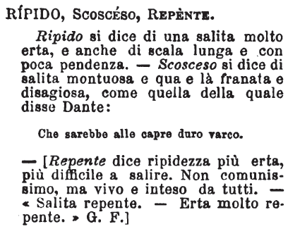 | Ripido, Scosceso, Repente - Ripido si dice di una salita molto erta, e anche di scala lunga e con poca pendenza. - Scosceso si dice di salita montuosa e qua e là franata e disagiosa, come quella della quale disse Dante: