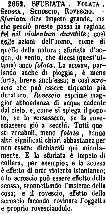 | Sfuriata, Folata, Scossa, Scroscio, Rovescio - Sfuriata dice impeto grande, ma che perciò presto passa in ragione del nil violentum durabile; così delle azioni dell'uomo, come di quelle della natura; sfuriata d'acqua, di vento, che dicesi (quest'ultima) anco folata. La scossa, parlando anche di pioggia, è meno forte, breve anch'essa; e così scroscio che può essere alquanto più duraturo. Rovescio esprime maggior abbondanza di acqua cadente dal cielo, e, come si spiega il popolo, se la versassero, se la rovesciassero giù a secchi. Tutti questi vocabili, meno folata, hanno altri significati chiari abbastanza per non essere dichiarati qui minutamente. E la sfuriata è impeto di collera, per esempio; e la scossa è effetto di urto violento istantaneo; e lo scroscio può essere effetto della scossa, sconnettendo l'insieme della cosa; e il rovescio, effetto dello scroscio facendo rovinare l'oggetto e proprio rovesciandolo. [immagine] |