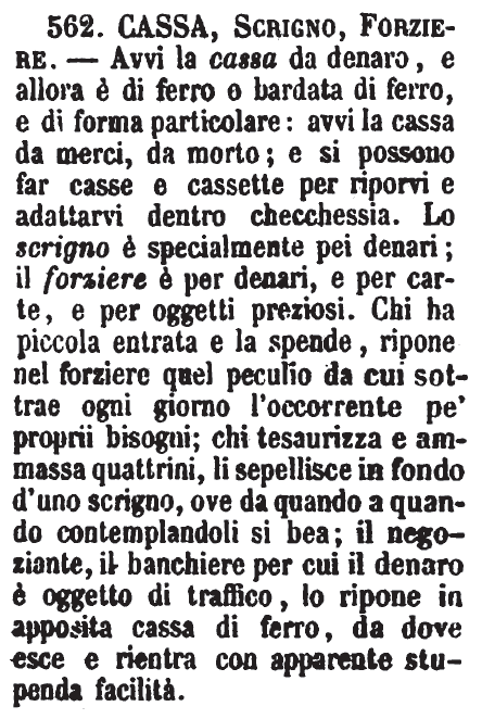 | Cassa, Scrigno, Forziere - Avvi la cassa da denaro, e allora è di ferro o bardata di ferro, e di forma particolare: avvi la cassa da merci, da morto; e si possono far casse e cassette per riporvi e adattarvi dentro checchessia. Lo scrigno è specialmente pei denari; il forziere è per denari, e per carte, e per oggetti preziosi. Chi ha piccola entrata e la spende, ripone nel forziere quel peculio da cui sottrae ogni giorno l'occorrente pe' proprii bisogni; chi tesaurizza e ammassa quattrini, li seppellisce in fondo d'uno scrigno, ove da quando a quando contemplandoli si bea; il negoziante, il banchiere per cui il denaro è oggetto di traffico, lo ripone in apposita cassa di ferro, da dove esce e rientra con apparente stupenda facilità. [immagine] |