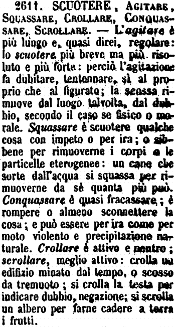 | Scuotere, Agitare, Squassare, Crollare, Conquassare, Scrollare - L'agitare è più lungo e, quasi direi, regolare: lo scuotere più breve ma più risoluto e più forte: perciò l'agitazione fa dubitare, tentennare, sì al proprio che al figurato; la scossa rimuove dal luogo talvolta, dal dubbio, secondo il caso se fisico o morale. Squassare è scuotere qualche cosa con impeto o per ira; o sibbene per rimuoverne i corpi o le particelle eterogenee: un cane che sorte dall'acqua si squassa per rimuoverne da sè quanta più può. Conquassare è quasi fracassare; è rompere o almeno sconnettere la cosa; e può essere per ira come per moto violento e precipitazione naturale. Crollare è attivo e neutro; scrollare, meglio attivo: crolla un edifizio minato dal tempo, o scosso da tremuoto; si crolla la testa per indicare dubbio, negazione; si scrolla un albero per farne cadere a terra i frutti. [immagine] |