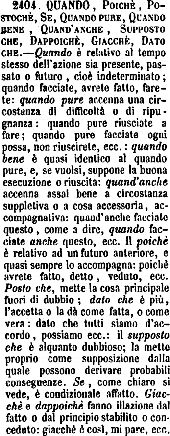 | Quando, Poiché, Postoché, Se, Quando pure, Quando bene, Quand’anche, Supposto che, Dappoiché, Giacché, Dato che - Quando è relativo al tempo stesso dell'azione sia presente, passato o futuro, cioè indeterminato; quando facciate, avrete fatto, farete: quando pure accenna una circostanza di difficoltà o di ripugnanza: quando pure riusciate a fare; quando pure facciate ogni possa, non riuscirete, ecc.: quando bene è quasi identico al quando pure, e, se vuolsi, suppone la buona esecuzione o riuscita: quand'anche accenna assai bene a circostanza suppletiva o a cosa accessoria, accompagnativa: quand'anche facciate questo, come a dire, quando facciate anche questo, ecc. Il poichè è relativo ad un futuro anteriore, e quasi sempre lo accompagna: poichè avrete fatto, detto, veduto, ecc. Posto che, mette la cosa principale fuori di dubbio; dato che è più, l'accetta o la dà come fatta, o come vera: dato che tutti siamo d'accordo, possiamo ecc.: il supposto che è alquanto dubbioso; la mette proprio come supposizione dalla quale possono derivare probabili conseguenze. Se, come chiaro si vede, è condizionale affatto. Giacchè e dappoichè fanno illazione dal fatto o dal principio stabilito o conceduto: giacchè è così, mi pare, ecc. [immagine] |