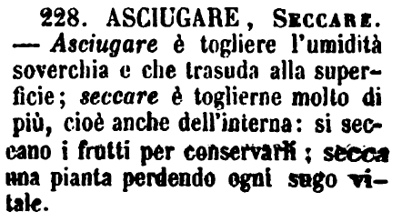 | Asciugare, Seccare - Asciugare è togliere l'umidità soverchia e che trasuda alla superficie; seccare è toglierne molto di più, cioè anche dell'interna: si seccano i frutti per conservarli; secca una pianta perdendo ogni sugo vitale. [immagine] |