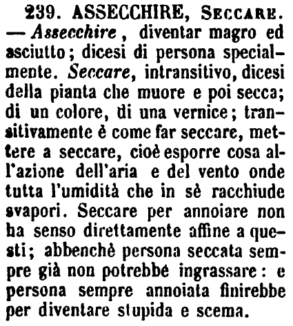 | Assecchire, Seccare - Assecchire, diventar magro ed asciutto; dicesi di persona specialmente. Seccare, intransitivo, dicesi della pianta che muore e poi secca; di un colore, di una vernice; transitivamente è come far seccare, mettere a seccare, cioè esporre cosa all'azione dell'aria e del vento onde tutta l'umidità che in sè racchiude svapori. Seccare per annoiare non ha senso direttamente affine a questi; abbenchè persona seccata sempre già non potrebbe ingrassare: e persona sempre annoiata finirebbe per diventare stupida e scema. [immagine] |