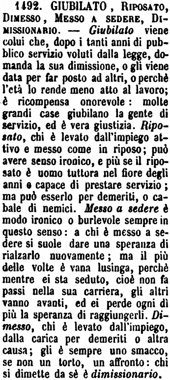 | Giubilato, Riposato, Dimesso, Messo a sedere, Dimissionario - Giubilato viene colui che, dopo i tanti anni di pubblico servizio voluti dalla legge, domanda la sua dimissione, o gli viene data per far posto ad altri, o perchè l'età lo rende meno atto al lavoro; è ricompensa onorevole: molte grandi case giubilano la gente di servizio, ed è vera giustizia. Riposato, chi è levato dall'impiego attivo e messo come in riposo; può avere senso ironico, e più se il riposato è uomo tuttora nel fiore degli anni e capace di prestare servizio; ma può esserlo per demeriti, o cabale di nemici. Messo a sedere è modo ironico o burlevole sempre in questo senso: a chi è messo a sedere si suole dare una speranza di rialzarlo nuovamente; ma il più delle volte è vana lusinga, perchè mentre ei sta seduto, cioè non fa passi nella sua carriera, gli altri vanno avanti, ed ei perde ogni dì più la speranza di raggiungerli. Dimesso, chi è levato dall'impiego, dalla carica per demeriti o altra causa; gli è sempre uno smacco, se non un torto, un affronto: chi si dimette da sè è dimissionario. [immagine] |