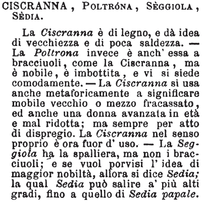 | Ciscranna, Poltrona, Seggiola, Sedia - La Ciscranna è di legno, e dà idea di vecchiezza e di poca saldezza. - La Poltrona invece è anch'essa a bracciuoli, come la Ciscranna, ma è nobile, è imbottita, e vi si siede comodamente. - La Ciscranna si usa anche metaforicamente a significare mobile vecchio o mezzo fracassato, ed anche una donna avanzata in età e mal ridotta; ma sempre per atto di dispregio. La Ciscranna nel senso proprio è ora fuor d'uso. - La Seggiola ha la spalliera, ma non i bracciuoli; e se vuol porvisi l'idea di maggior nobiltà, allora si dice Sedia; la quale Sedia può salire a' più alti gradi, fino a quello di Sedia papale. [immagine] |