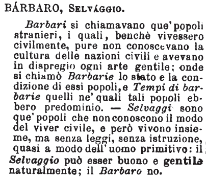 | Barbaro, Selvaggio - Barbari si chiamavano que' popoli stranieri, i quali, benchè vivessero civilmente, pure non conoscevano la cultura delle nazioni civili e avevano in dispregio ogni arte gentile; onde si chiamò Barbarie lo stato e la condizione di essi popoli, e Tempi di barbarie quelli ne' quali tali popoli ebbero predominio. - Selvaggi sono que' popoli che non conoscono il modo del viver civile, e però vivono insieme, ma senza leggi, senza istruzione, quasi a modo dell'uomo primitivo: il Selvaggio può esser buono e gentile naturalmente; il Barbaro no. [immagine] |