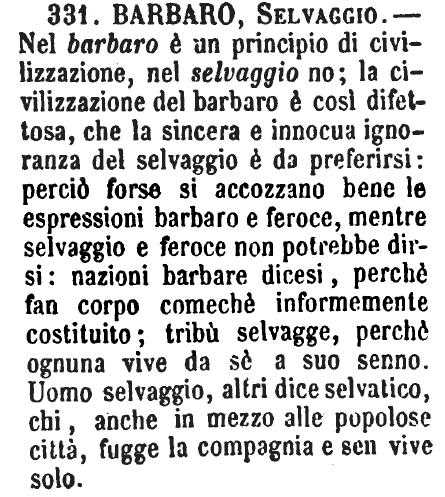 | Barbaro, Selvaggio - Nel barbaro è un principio di civilizzazione, nel selvaggio no; la civilizzazione del barbaro è così difettosa, che la sincera e innocua ignoranza del selvaggio è da preferirsi: perciò forse si accozzano bene le espressioni barbaro e feroce, mentre selvaggio e feroce non potrebbe dirsi: nazioni barbare dicesi, perchè fan corpo comechè informemente costituito; tribù selvagge, perchè ognuna vive da sè a suo senno. Uomo selvaggio, altri dice selvatico, chi, anche in mezzo alle popolose città, fugge la compagnia e sen vive solo. [immagine] |