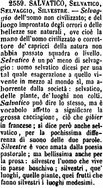 | Salvatico, Selvatico, Selvaggio, Silvestre - Selvaggio dell'uomo non civilizzato; e del luogo improntato degli orrori o delle bellezze sue naturali, ove cioè la mano dell'uomo civilizzato o correttore de' capricci della natura non abbia passato squadra o livello. Selvatico è un po' meno di selvaggio: uomo selvatico dicesi per una tal quale esagerazione a quello vivente in mezzo al mondo sì, ma aborrente dalla società: selvatico, delle piante, de' luoghi non colti. Salvatico può dire lo stesso, ma è vocabolo affetto a significare la grossa cacciagione, ciò che gibier in francese; si dice però anche selvatico, per la pochissima differenza di suono delle due parole. Silvestre è voce amata dalla poesia pastorale; ma bellissima anche per la prosa: silvestre l'uomo che vive in paese boschivo; silvestri, que' luoghi, quelle piante, quei frutti che fanno silvestri i luoghi medesimi. [immagine] |