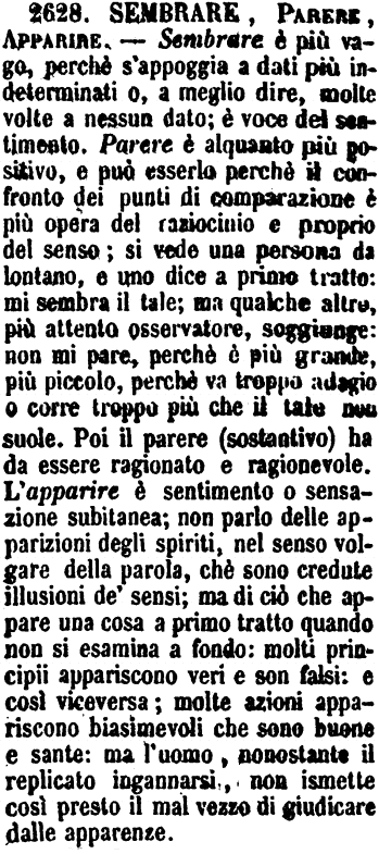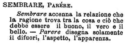 | Sembrare, Parere - Sembrare accenna la relazione che la ragione trova tra la cosa e ciò che debbe essere il buono, il vero e il bello. - Parere disegna solamente il difuori, l'aspetto, l'apparenza. [immagine] |