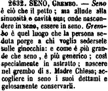 | Seno, Grembo - Seno è ciò che il petto; ma allude alla sinuosità e cavità sua; onde nascondere in seno, essere in seno. Grembo è quel luogo che la persona seduta porge a chi voglia sedersele sulle ginocchia: e come è più grande che seno, è più generico; così specialmente in astratto; nascere nel grembo di s. Madre Chiesa; accogliere in seno i suoi dettami e gelosamente conservarli. [immagine] |
