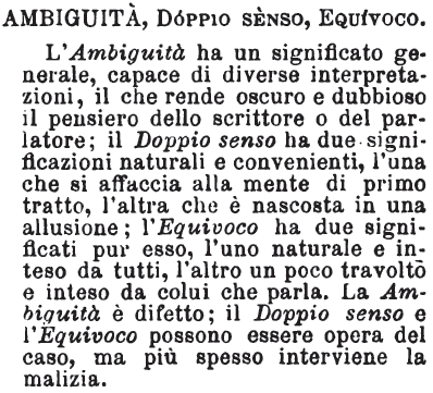 | Ambiguità, Doppio senso, Equivoco - L'Ambiguità ha un significato generale, capace di diverse interpretazioni, il che rende oscuro e dubbioso il pensiero dello scrittore o del parlatore; il Doppio senso ha due significazioni naturali e convenienti, l'una che si affaccia alla mente di primo tratto, l'altra che è nascosta in una allusione; l'Equivoco ha due significati pur esso, l'uno naturale e inteso da tutti, l'altro un poco travolto e inteso da colui che parla. La Ambiguità è difetto; il Doppio senso e l'Equivoco possono essere opera del caso, ma più spesso interviene la malizia. [immagine] |