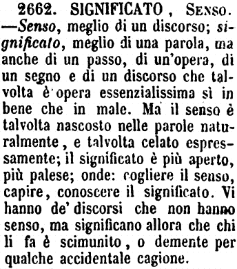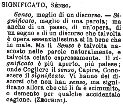 | Significato, Senso - Senso, meglio di un discorso; significato, meglio di una parola, ma anche di un passo, di un'opera, di un segno e di un discorso che talvolta è opera essenzialissima sì in bene che in male. Ma il senso è talvolta nascosto nelle parole naturalmente, e talvolta celato espressamente; il significato è più aperto, più palese; onde: cogliere il senso, capire, conoscere il significato. Vi hanno de' discorsi che non hanno senso, ma significano allora che chi li fa è scimunito, o demente per qualche accidentale cagione. [immagine] |