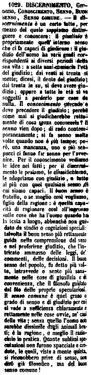 | Discernimento, Giudizio, Conoscimento, Senno, Buon senso, Senso comune - Il discernimento è un certo fatto, per mezzo del quale sappiamo distinguere e conoscere: il giudizio è propriamente quell'interno senso che ci fa capaci di giudicare: il giudizio dell'uomo ha varii gradi corrispondenti ai diversi periodi della sua vita: a sette anni comincia l'età del giudizio; dai venti ai trenta si mette; dicesi, il dente del giudizio; dai trenta in su, si deve avere giudizio; eppure a tutte le età si va soggetti a perderlo per cose da nulla. Il conoscimento precede e deve precedere il giudizio; perchè come mai si giudicherebbe rettamente di cosa senza conoscerla? Il senno vien dopo; di rado contemporaneamente; si fa senno molte volte quando non è più tempo; però, una mancanza, uno o più scapucci ci fanno far senno per l'avvenire. Per il conoscimento vediamo le idee nei fatti; per il discernimento le pesiamo, le classifichiamo, le adopriamo con giudizio, o tutto al più con quel qualsiasi senno di cui siamo capaci. Il buon senso è fratello, o se meglio così vogliamo, figlio della ragione: è quella capacità di ragionare così all'ingrosso sulle cose che ha l'uomo quando ha la testa a luogo, abbenchè non guidato da studio o cognizioni speciali: talvolta il buon senso più rettamente guida nella comprensione del vero e nel proferirne giudizio, che l'intricato ammasso delle leggi, de' commenti, delle decisioni. Il buon senso del popolo, fu detto più volte, intravvede o sente più sanamente nelle cose di giustizia e di convenienza, che il filosofo guidato dal filo delle proprie speculazioni. Il senso comune è quel grano o grado di senno e di giudizio per cui si vede a sufficienza chiaramente e rettamente nelle cose ovvie, ne' casi della vita; senza quello l'uomo non sarebbe dissimile dagli animali bruti; è la ragione, o meglio il raziocinio in pratica. Quante sublimi speculazioni non furono spacciate e credute, le quali, viste a mente quieta, si riconobbero prive di senso, non dirò già filosofico, ma del buon senso comune! [immagine] |