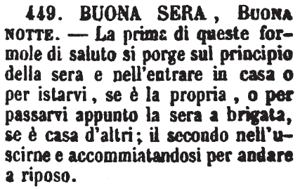 | Buona sera, Buona notte - La prima di queste formole di saluto si porge sul principio della sera e nell'entrare in casa o per istarvi, se è la propria, o per passarvi appunto la sera a brigata, se è casa d'altri; il secondo nell'uscirne e accommiatandosi per andare a riposo. [immagine] |