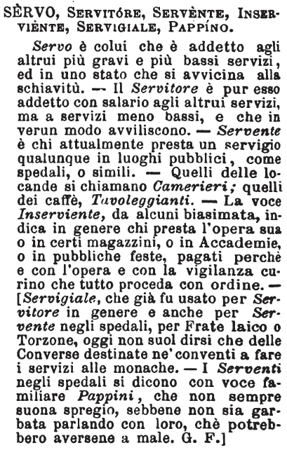 | Servo, Servitore, Servente, Inserviente, Servigiale, Pappino - Servo è colui che è addetto agli altrui più gravi e più bassi servizi, ed in uno stato che si avvicina alla schiavitù. - Il Servitore è pur esso addetto con salario agli altrui servizi, ma a servizi meno bassi, e che in verun modo avviliscono. - Servente è chi attualmente presta un servigio qualunque in luoghi pubblici, come spedali, o simili. - Quelli delle locande si chiamano Camerieri; quelli dei caffè, Tavoleggianti. - La voce Inserviente, da alcuni biasimata, indica in genere chi presta l'opera sua o in certi magazzini, o in Accademie, o in pubbliche feste, pagati perchè e con l'opera e con la vigilanza curino che tutto proceda con ordine. - [Servigiale, che già fu usato per Servitore in genere e anche per Servente negli spedali, per Frate laico o Torzone, oggi non suol dirsi che delle Converse destinate ne' conventi a fare i servizi alle monache. - I Serventi negli spedali si dicono con voce familiare Pappini, che non sempre suona spregio, sebbene non sia garbata parlando con loro, chè potrebbero aversene a male. G. F.] [immagine] |