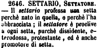 | Settario, Settatore - Il settario professa una setta perché nato in quella, e perché l'ha abbracciata; il settatore è proclive a ogni setta, purché dissidente, eterodossa, protestante, ed è anche promotore di setta. [immagine] |