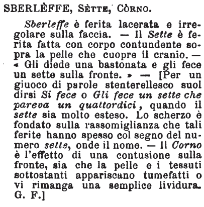 | Sberleffe, Sette, Corno - Sberleffe è ferita lacerata e irregolare sulla faccia. - Il Sette è ferita fatta con corpo contundente sopra la pelle che cuopre il cranio. - «Gli diede una bastonata e gli fece un sette sulla fronte.» - [Per un giuoco di parole stenterellesco suol dirsi Si fece o Gli fece un sette che pareva un quattordici, quando il sette sia molto esteso. Lo scherzo è fondato sulla rassomiglianza che tali ferite hanno spesso col segno del numero sette, onde il nome. - Il Corno è l'effetto di una contusione sulla fronte, sia che la pelle e i tessuti sottostanti appariscano tumefatti o vi rimanga una semplice lividura. G.F.] [immagine] |