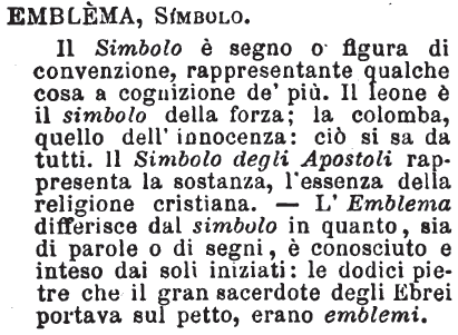 | Emblema, Simbolo - Il Simbolo è segno o figura di convenzione, rappresentante qualche cosa a cognizione de' più. Il leone è il simbolo della forza; la colomba, quello dell'innocenza: ciò si sa da tutti. Il Simbolo degli Apostoli rappresenta la sostanza, l'essenza della religione cristiana. - L'Emblema differisce dal simbolo in quanto, sia di parole o di segni, è conosciuto e inteso dai soli iniziati: le dodici pietre che il gran sacerdote degli Ebrei portava sul petto, erano emblemi. [immagine] |