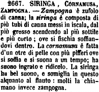 | Siringa, Cornamusa, Zampogna - Zampogna è zufolo di canna. - La Siringa è composta di più tubi di canna messi in iscala, dal più grosso scendendo al più sottile e più corto, ove si fischia soffiandovi dentro. - La Cornamusa è fatta di un otre di pelle con più pifferi ove si soffia e si suona ad un tempo. Ha suono ingrato e ridicolo. La Siringa ha bel suono, e somiglia in questo alquanto al flauto. Molti la chiamano invece Zampogna. (Zecchini). - [Siringa non è voce popolare, e Zampogna, sia pure impropriissimamente, tien luogo di tutte le altre nella lingua parlata. Noto il fatto come lessicografo, non lo lodo come sinonimista. - Lo Zufolo poi nessuno in Toscana lo dice Zampogna. G. F.] [immagine] |