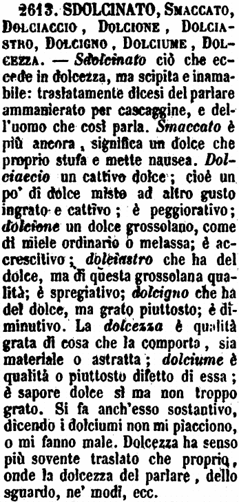 | Sdolcinato, Smaccato, Dolciaccio, Dolcione, Dolciastro, Dolcigno, Dolciume, Dolcezza - Sdolcinato ciò che eccede in dolcezza, ma scipita e inamabile: traslatamente dicesi del parlare ammanierato per cascaggine, e dell'uomo che così parla. Smaccato è più ancora, significa un dolce che proprio stufa e mette nausea. Dolciaccio un cattivo dolce; cioè un po' di dolce misto ad altro gusto ingrato e cattivo; è peggiorativo; dolcione un dolce grossolano, come di miele ordinario o melassa; è accrescitivo; dolciastro che ha del dolce, ma di questa grossolana qualità; è spregiativo; dolcigno che ha del dolce, ma grato piuttosto; è diminutivo. La dolcezza è qualità grata di cosa che la comporta, sia materiale o astratta; dolciume è qualità o piuttosto difetto di essa; è sapore dolce sì ma non troppo grato. Si fa anch'esso sostantivo, dicendo i dolciumi non mi piacciono, o mi fanno male. Dolcezza ha senso più sovente traslato che proprio, onde la dolcezza del parlare, dello sguardo, ne' modi, ecc. [immagine] |