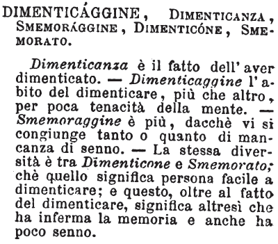 | Dimenticaggine, Dimenticanza, Smemoraggine, Dimenticone, Smemorato - Dimenticanza è il fatto dell'aver dimenticato. - Dimenticaggine l'abito del dimenticare, più che altro, per poca tenacità della mente. - Smemoraggine è più, dacchè vi si congiunge tanto o quanto di mancanza di senno. - La stessa diversità è tra Dimenticone e Smemorato; chè quello significa persona facile a dimenticare; e questo, oltre al fatto del dimenticare, significa altresì che ha inferma la memoria e anche ha poco senno. [immagine] |