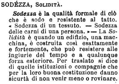 Sodezza - S. f. Qualità di ciò che è sodo; Durezza. Soliditas, aureo. [Cont.] Pall. A. Arch. I. 7. Se 'l terren sarà sodo e fermo, tanto in quello si caverà sotto quanto parerà al giudizioso architetto che richieda la qualità della fabbrica, e la sodezza di esso terreno. Vas. Arch. III. Palazzi i quali, per la sodezza e collegazione delle pietre, sono durati e mantenuti più che non hanno fatto tutti gli altri edificii. = Cr. 2. 8. 9. (C) Per la sodezza sua ritiene più natural colore. E num. 10. L'umore più lungamente dimora in cotal modo, sì per la tortezza, e sì ancora per la sodezza. Vegez. 154. I quali per la sodezza sono più gravi, e acconci a gittare. Baldin. Voc. Dis. 153. (Man.) E questo chiamano (gli architetti) sodo del terreno, quantunque non sempre si trovi della medesima sodezza. [G.M.] Segner. Mann. Marz. 9. Un principe, per risolvere se una moneta si abbia da ammettere nel suo Stato, che fa? Si contenta della apparenza? Non già: la fa gettare nel fuoco; perciocchè quivi subito si vedrà se corrisponde alla beltà la sodezza. E Quares. 14. 1. Gran Dio che avete in vostra mano le chiavi di quelle porte, alla cui sodezza non v'è diaspro nè diamante da mettersi in paragone, deh! vi piaccia un poco prestarmele per breve ora (le chiavi delle porte dell'inferno).