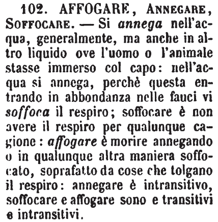 | Affogare, Annegare, Soffocare - Si annega nell'acqua, generalmente, ma anche in altro liquido ove l'uomo o l'animale stasse immerso col capo: nell'acqua si annega, perchè questa entrando in abbondanza nelle fauci vi soffoca il respiro; soffocare è non avere il respiro per qualunque cagione: affogare è morire annegando o in qualunque altra maniera soffocato, soprafatto da cose che tolgano il respiro: annegare è intransitivo, soffocare e affogare sono e transitivi e intransitivi. [immagine] |
