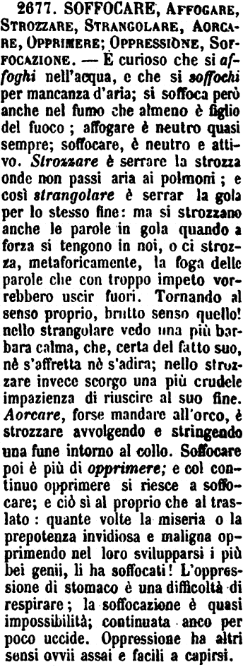 | Soffocare, Affogare, Strozzare, Strangolare, Aorcare, Opprimere; Oppressione, Soffocazione - È curioso che si affoghi nell'acqua, e che si soffochi per mancanza d'aria; si soffoca però anche nel fumo che almeno è figlio del fuoco; affogare è neutro quasi sempre; soffocare, è neutro e attivo. Strozzare è serrare la strozza onde non passi aria ai polmoni; e così strangolare è serrar la gola per lo stesso fine: ma si strozzano anche le parole in gola quando a forza si tengono in noi, o ci strozza, metaforicamente, la foga delle parole che con troppo impeto vorrebbero uscir fuori. Tornando al senso proprio, brutto senso quello! nello strangolare vedo una più barbara calma, che, certa del fatto suo, nè s'affretta nè s'adira; nello strozzare invece scorgo una più crudele impazienza di riuscire al suo fine. Aorcare, forse mandare all'orco, è strozzare avvolgendo e stringendo una fune intorno al collo. Soffocare poi è più di opprimere; e col continuo opprimere si riesce a soffocare; e ciò sì al proprio che al traslato: quante volte la miseria o la prepotenza invidiosa e maligna opprimendo nel loro svilupparsi i più bei genii, li ha soffocati! L'oppressione di stomaco è una difficoltà di respirare; la soffocazione è quasi impossibilità; continuata anco per poco uccide. Oppressione ha altri sensi ovvii assai e facili a capirsi. [immagine] |