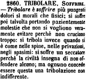 | Tribolare, Soffrire - Tribolare è soffrire più pungenti dolori sì morali che fisici; si soffre poi talvolta portando pazientemente molestie che non si vogliono veramente evitare perchè non cruciano troppo: si tribola invece quando si è come nelle spine, nelle privazioni, negli spasimi: si soffre un seccatore perchè la civiltà insegna di non offendere alcuno; ma ognuno concede essere questa una tribolazione non indifferente. [immagine] |