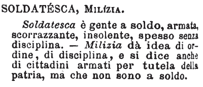 Milite, Militare, Soldato; Milizia, Soldatesca - Milite, chi è ascritto alla milizia regolare o cittadina; ma forse, nelle odierne idee, più a questa che a quella: militare dice lo stato, e meglio la professione: di tre fratelli uno è militare, l'altro borghese, il terzo ecclesiastico: soldato dice lo stato e la qualità: soldato assolutamente il semplice fantaccino; ma del generale, se ha dato buone prove di sé in guerra, dicesi, è un buon soldato. Soldatesca, numero di soldati, ma disordinati e indisciplinati; questo vocabolo esprime in genere o disprezzo o dispetto. Milizia ha miglior senso, ora: le milizie cittadine in Francia, dette colà guardia nazionale, sono un saldo puntello dell'ordine e della pace. Correggendo le bozze di questo foglio, oggi 12 novembre 1848, cioè un anno e più dopo che fu scritto, mi gode l'animo nel poter dire, che anche nella Romagna e in Toscana si stanno organizzando queste milizie cittadine, speranza della patria italiana. In senso storico, milizia non ha migliore o diverso senso di soldatesca (1).