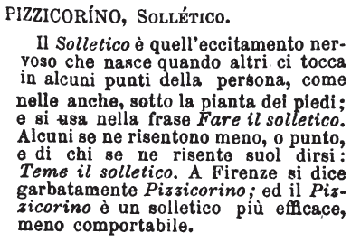 | Pizzicorino, Solletico - Il Solletico è quell'eccitamento nervoso che nasce quando altri ci tocca in alcuni punti della persona, come nelle anche, sotto la pianta dei piedi; e si usa nella frase Fare il solletico. Alcuni se ne risentono meno, o punto, e di chi se ne risente suol dirsi: Teme il solletico. A Firenze si dice garbatamente Pizzicorino; ed il Pizzicorino è un solletico più efficace, meno comportabile. [immagine] |